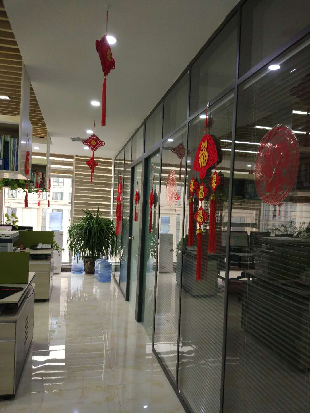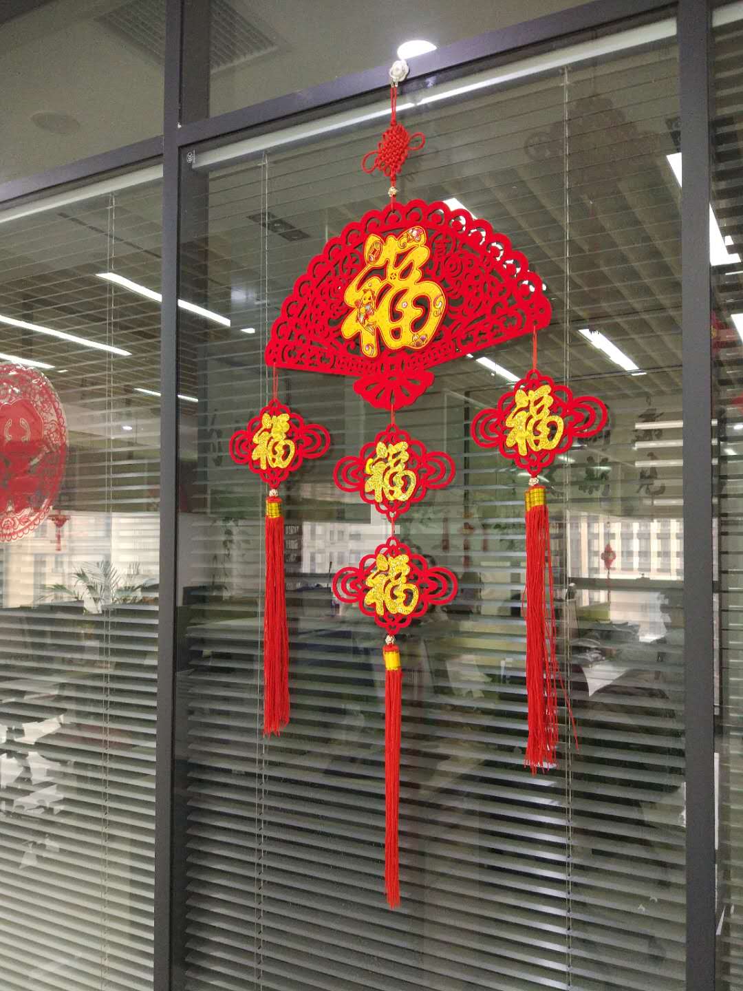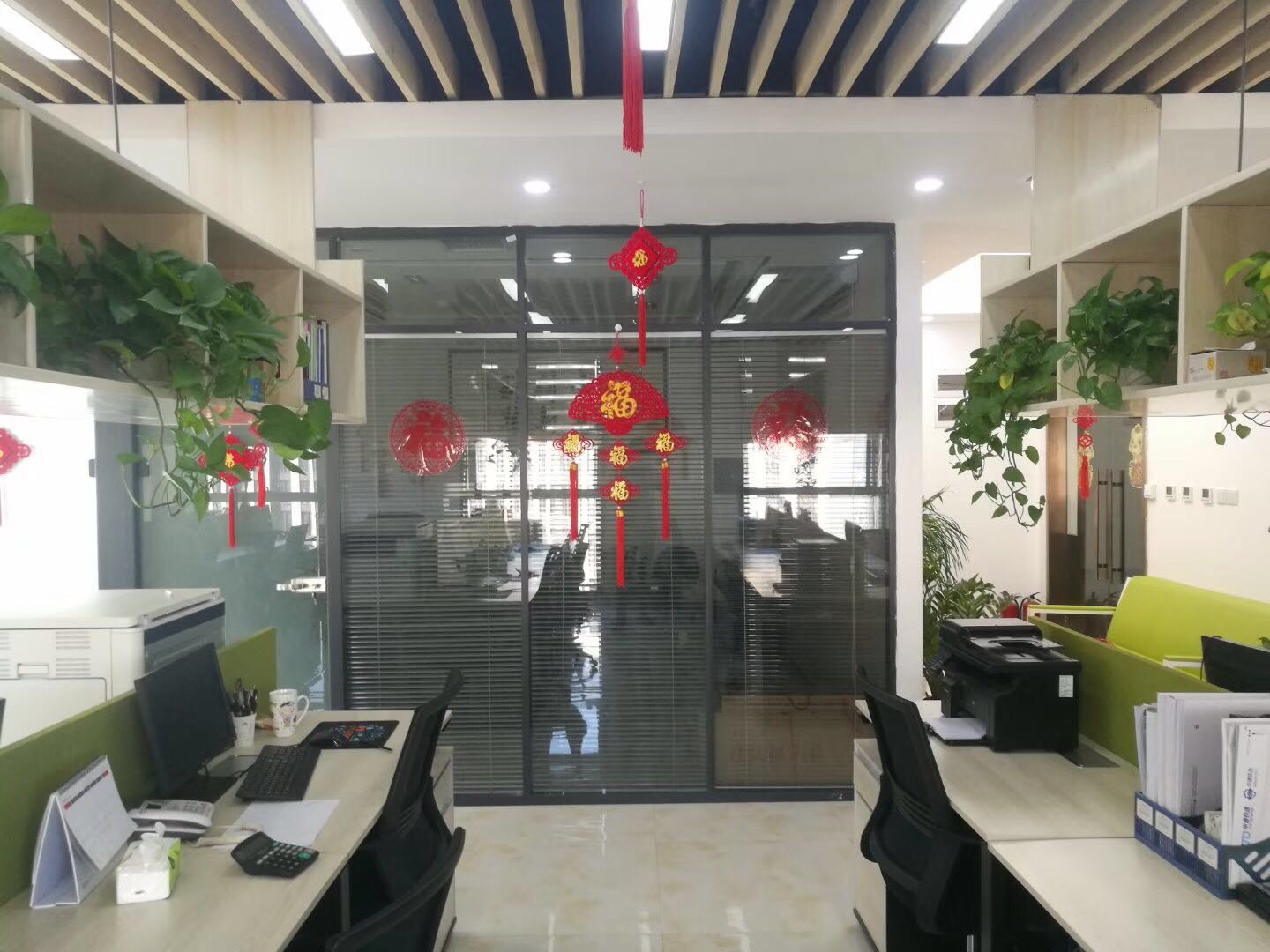 銷售部墻上和門上都分別掛上和貼上大大的“福”字,公司門口的兩盆綠植也掛滿了大紅包,辦公室內到處一片喜氣洋洋的氣氛。